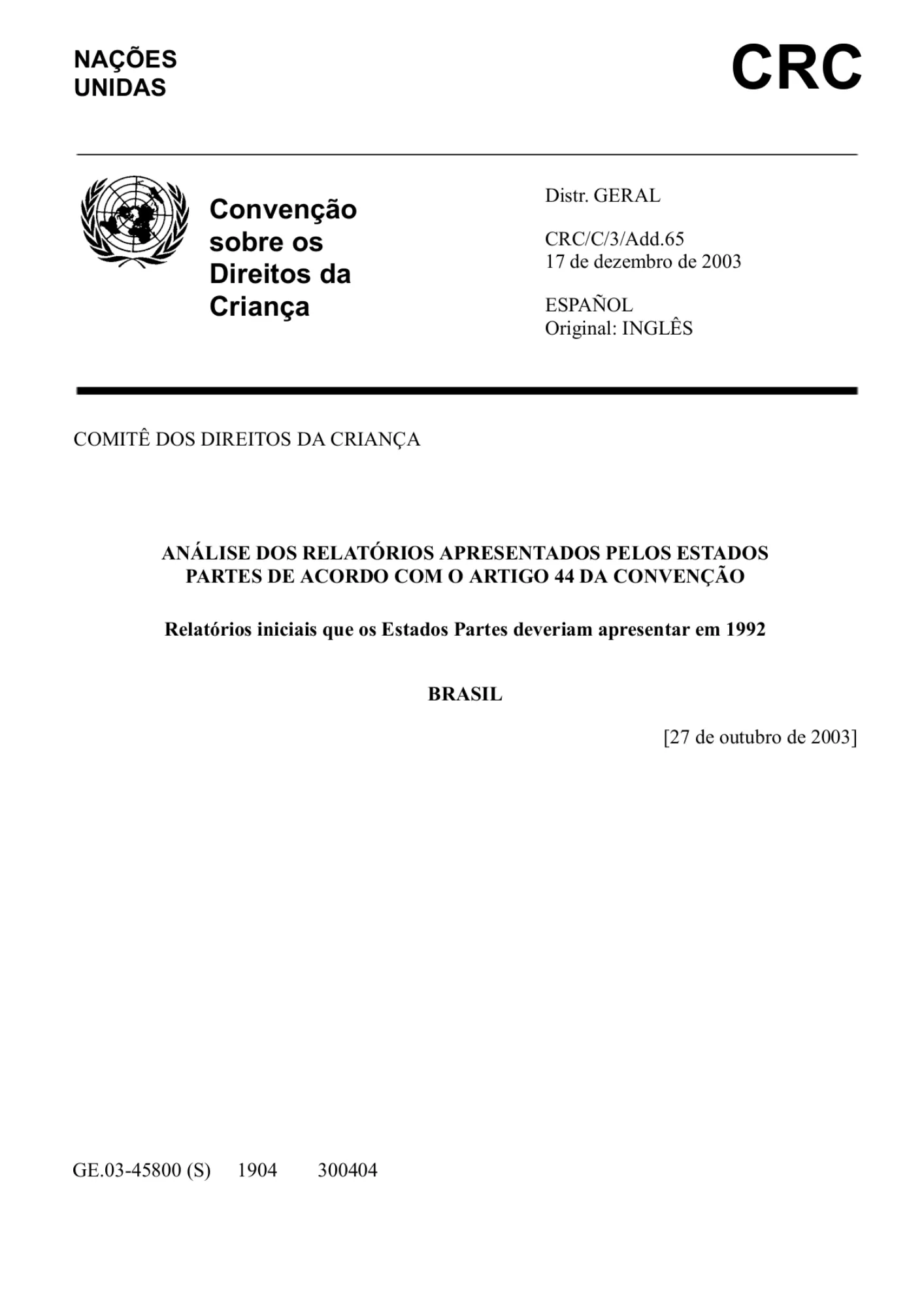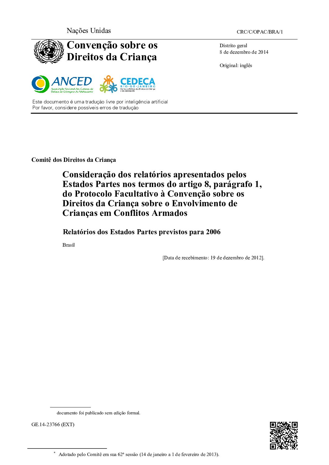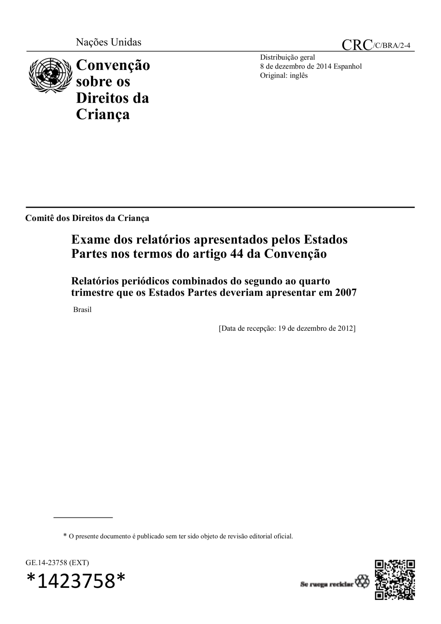 V-VII Relatórios Periódicos Combinados do Estado Brasileiro sobre a Implementação da Convenção sobre os Direitos da Criança